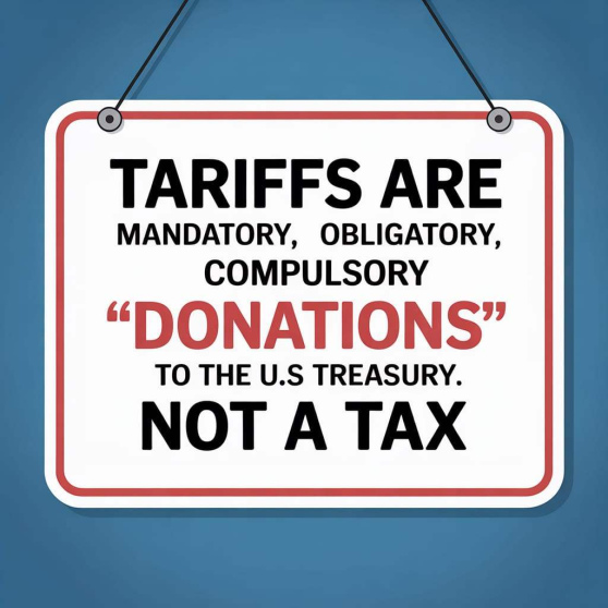 Tariffs are Mandatory, Obligatory, Compulsory "Donations" to the U.S Treasury. Paid by people like you.